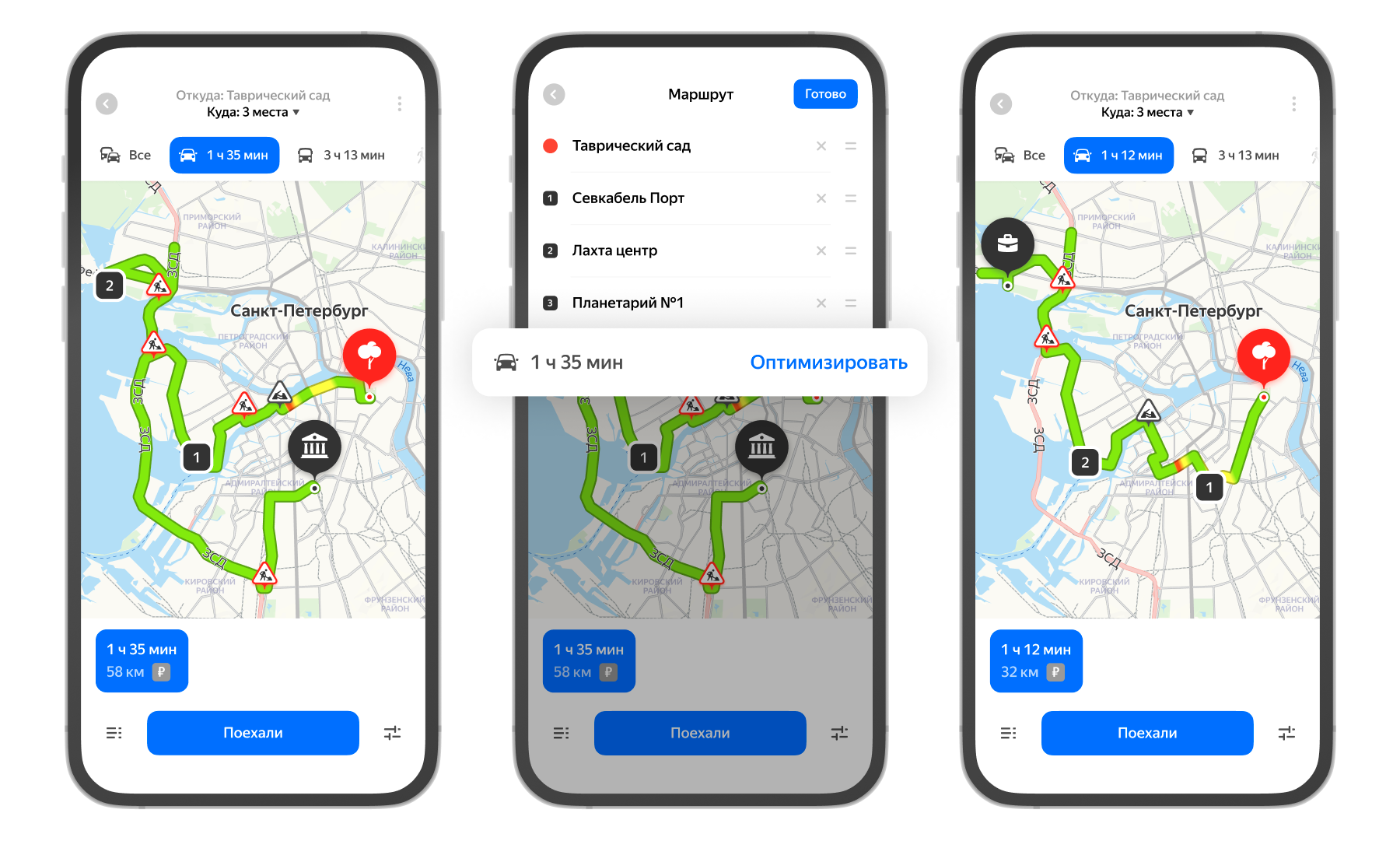 Оптимизация работает на пешеходных маршрутах, а также маршрутах на автомобиле и общественном транспорте. Автомобильные маршруты учитывают не только расположение мест, но и пробки на дорогах. Опция есть в приложении и веб-версии «Яндекс Карт».